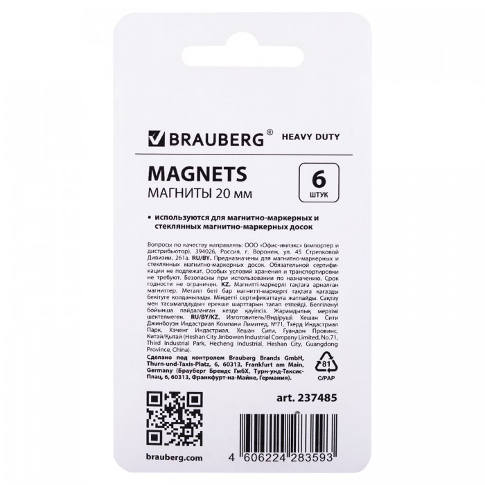 Набор мощных неодимовых магнитов BRAUBERG "HEAVY DUTY" используются для магнитно-маркерных и стеклянных магнитно-маркерных досок. Благодаря большой силе удерживают до 6 раз больше листов бумаги на магнитной поверхности.