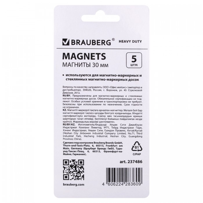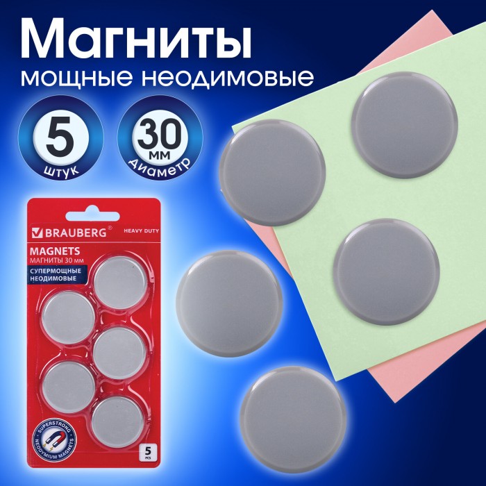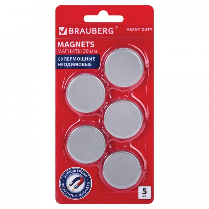 Набор мощных неодимовых магнитов BRAUBERG "HEAVY DUTY" используются для магнитно-маркерных и стеклянных магнитно-маркерных досок. Благодаря большой силе удерживают до 6 раз больше листов бумаги на магнитной поверхности.