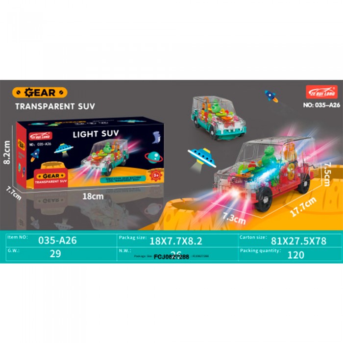Размер упаковки: 18*7,7*8,2 см Размер изделия: 17,7*3*7,5 см Функционал: инерционный механизм, прозрачный корпус, внутри цветные шестеренки, подвижные элементы, свет, звук Упаковка: картонная коробка Страна обладатель бренда: КНР Материал: пластик, металл Комплектация: машинка - 1 шт. Возраст ребенка: от 3 лет Яркая модель представляет собой машинку в прозрачном корпусе. Внутри со световыми и звуковыми эффектами при движении вращаются цветные шестеренки. Работает от батареек. Серия интерактивных машин позволит собрать свою коллекцию самых разных моделей транспорта. Проработанные детали делают процесс игры увлекательнее, а модели придают реалистичность. Все модели серии функциональны - с ними можно придумать интересные игры. Такой автомобиль станет хорошим подарком юному коллекционеру или просто любителю автомобилей. Колеса с инерционным механизмом позволяют автобусу легко двигаться. Подходит для игр дома и на улице. Изготовлена из безопасных и прочных материалов.