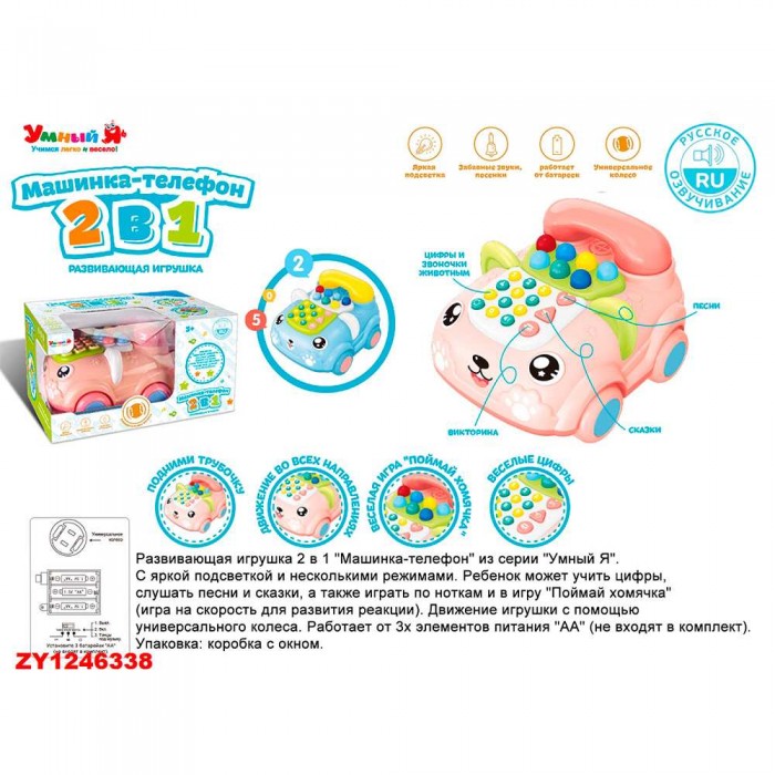 Размер упаковки: 24 х 17 х 13 см Размер изделия: 16,5 х 15 х 16 см Функционал: музыкальная игрушка Вид упаковки: картонная коробка блистерного типа Страна производитель: Китай Материал: пластик Комплектация: игрушка - 1 шт Возраст ребенка: для детей от 3 лет Яркая музыкальная игрушка обязательно понравится ребенку и поможет ему в обучении. Особенности: - веселая игра "Поймай хомячка" - песни, сказки, викторина - цифры и звуковые эффекты - яркая подсветка - игровые режимы - подвижные колеса машинки - для работы необходимы 3 батареи АА 1.5V (не входят в комплект) кнопки с яркой подсветкой - качественные материалы