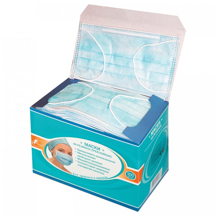 Медицинские одноразовые маски по 100 штук в коробке с перфорированной крышкой для использования в клиниках.