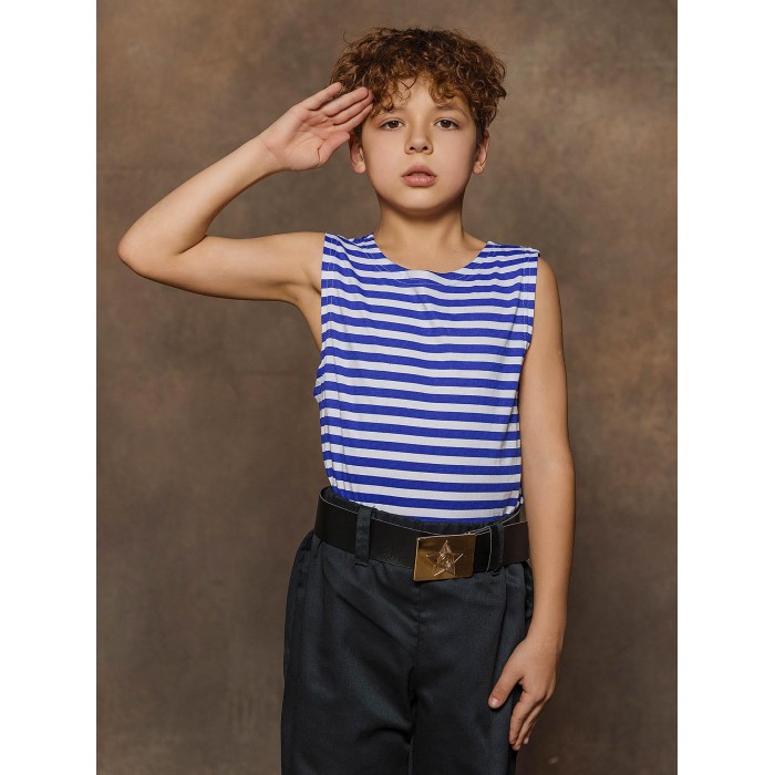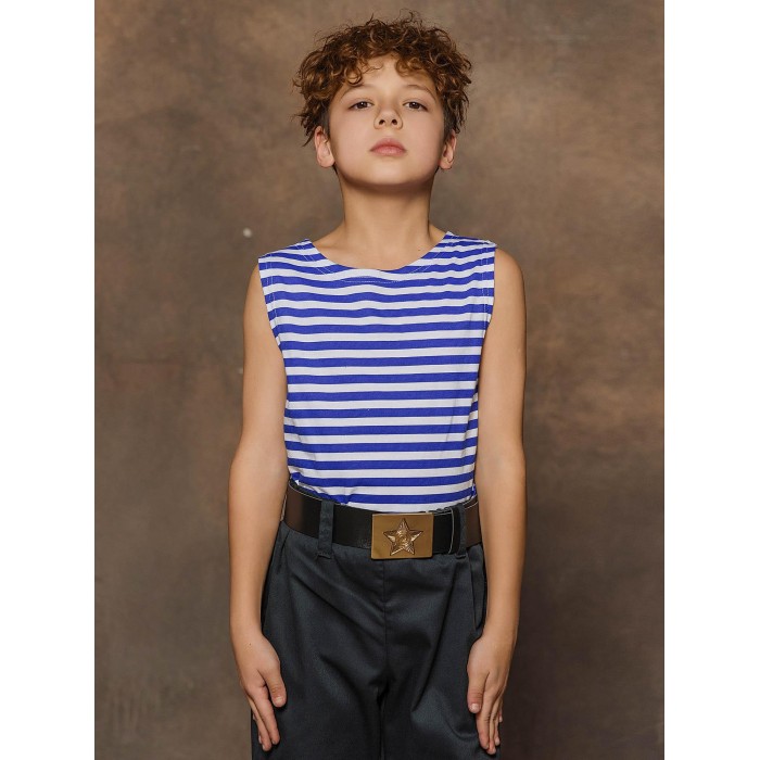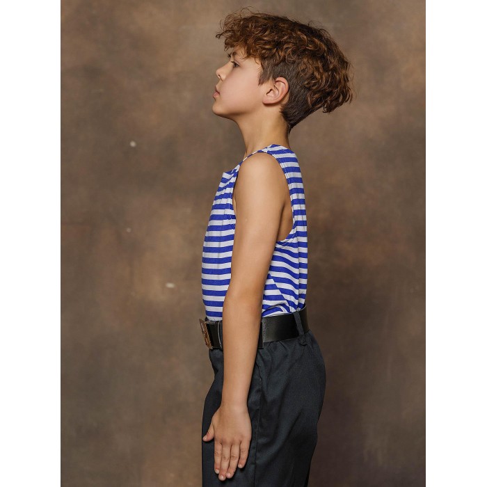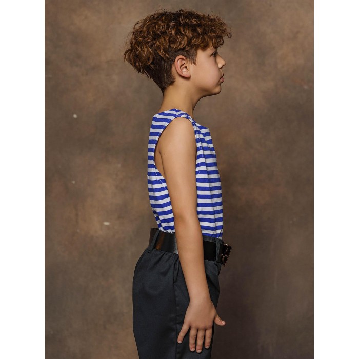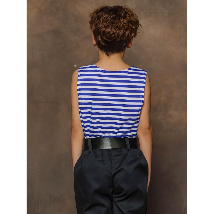 Майка тельняшка детская в синюю полоску из натурального хлопка. Майка-тельняшка прямого силуэта с круглым вырезом горловины, 100% хлопок. Можно использовать в качестве нательного белья, одежды для дома и карнавальных образов.