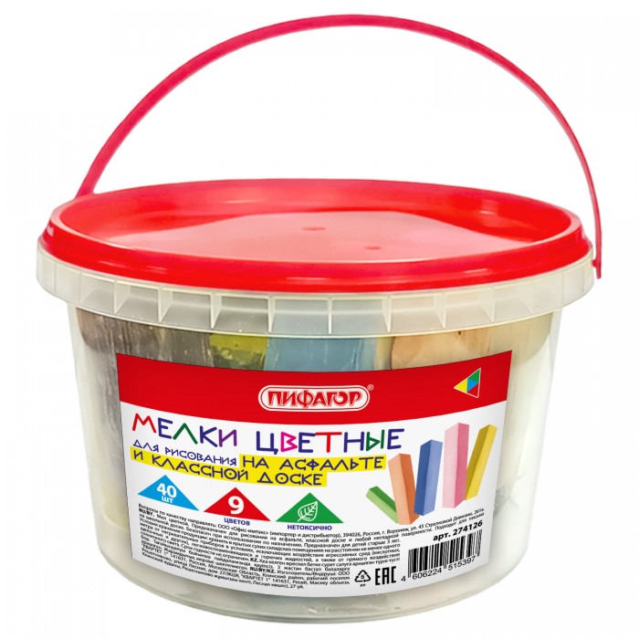 Мел в ведерке для асфальта и классной доски 40 штук, цветной квадратный, ПИФАГОР, 274126