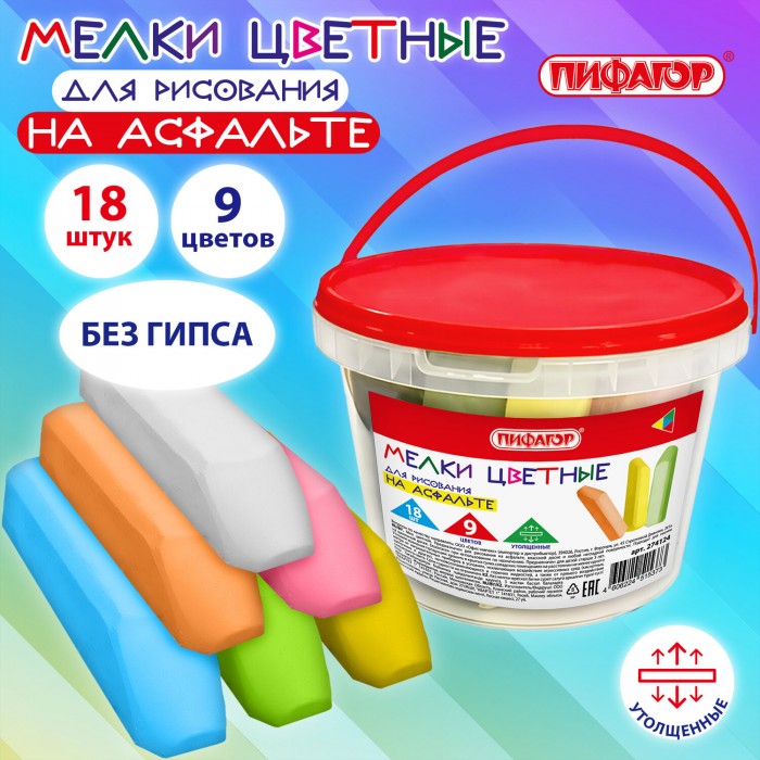 Мел в ведерке для рисования на асфальте 18 штук, ПИФАГОР, цветной квадратный утолщенный, 274124
