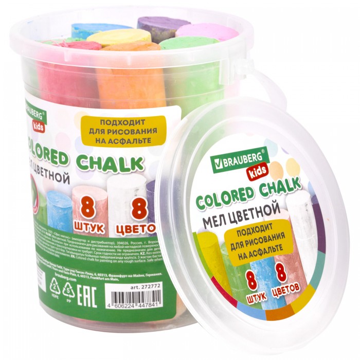Мел в ведерке для рисования на асфальте 8 штук, цветной круглый, BRAUBERG KIDS, 272772