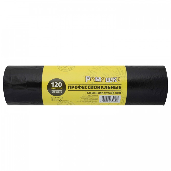 Мешки для мусора 120 л, черные, в рулоне 50 шт,. ПВД 27 мкм, 68x105 см, РОМАШКА "ПРОФИ", ВР-0064