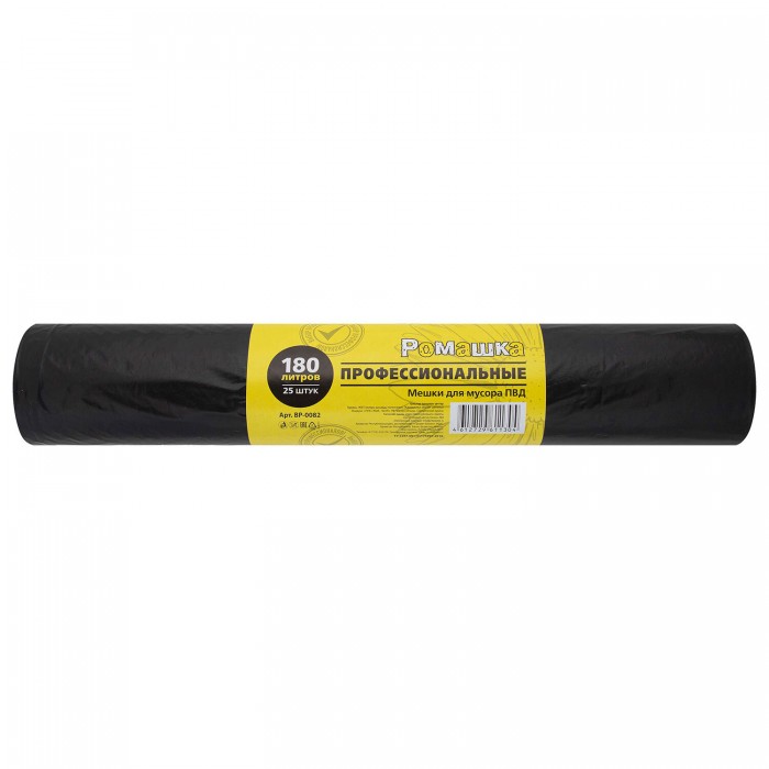 Мешки для мусора 180 л, черные, в рулоне 25 шт., ПВД 30 мкм, 90x110 см, РОМАШКА "ПРОФИ", ВР-0082