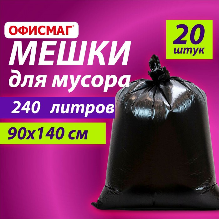 Мешки для мусора 240 л черные, в пачке 20 шт., ОСОБО ПРОЧНЫЕ, ПВД 60 мкм, 90х140 см, ОФИСМАГ, 609340