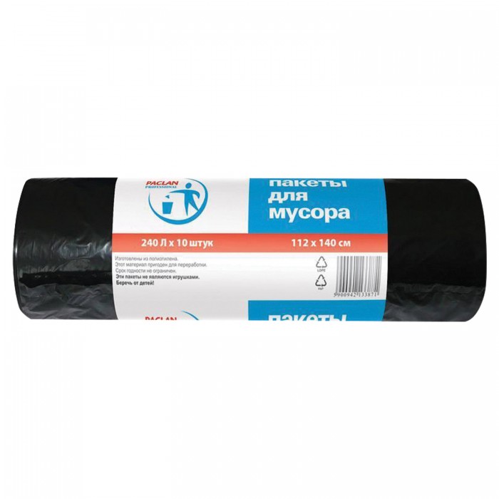 Мешки для мусора 240 л, черные, в рулоне 10 шт., ПВД, 30 мкм, 112х140 см, PACLAN Professional, 1338717