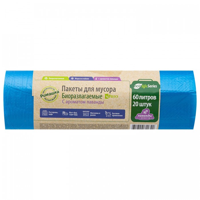 Мешки для мусора биоразлагаемые 60 л, синие, в рулоне 20 шт., ПНД 6,5 мкм, 58х68 см, "ЭКОЛАЙФ", ЭЛБ602040С