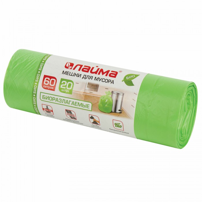 Мешки для мусора биоразлагаемые 60 л зеленые в рулоне 20 шт. прочные, ПНД 15 мкм, 60х70 см, LAIMA, 601401