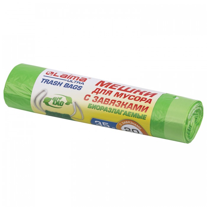 Мешки для мусора биоразлагаемые с завязками LAIMA "ULTRA" 35 л, рулон 20 шт., прочные, ПНД 14 мкм, 50х60 см, 607688