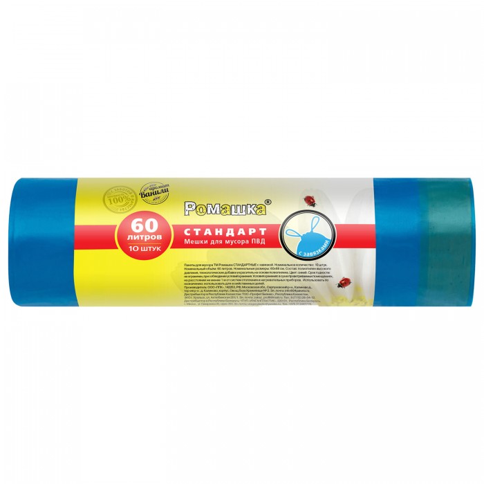 Мешки для мусора с завязками 60л синие, в рулоне 10шт, ПВД 25 мкм, 60х68 см, РОМАШКА,, ЗВС6010С