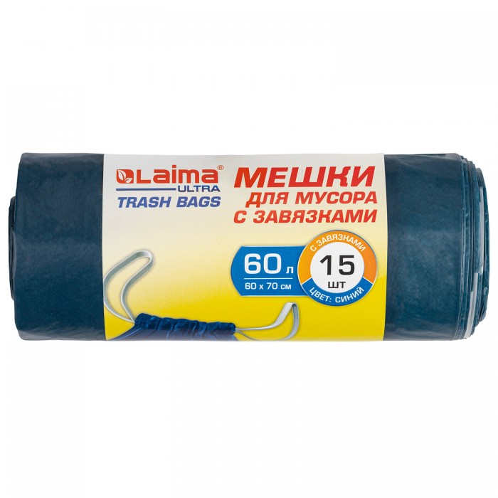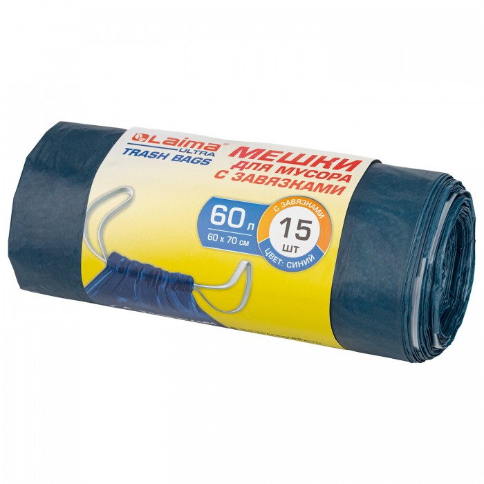 Мешки для мусора с завязками LAIMA "ULTRA", 60 л, синие, рулон 15 шт., особо прочные, ПСД 30 мкм, 60х70 см, 607696