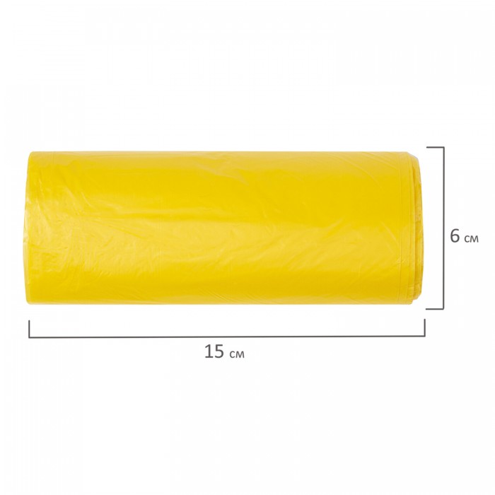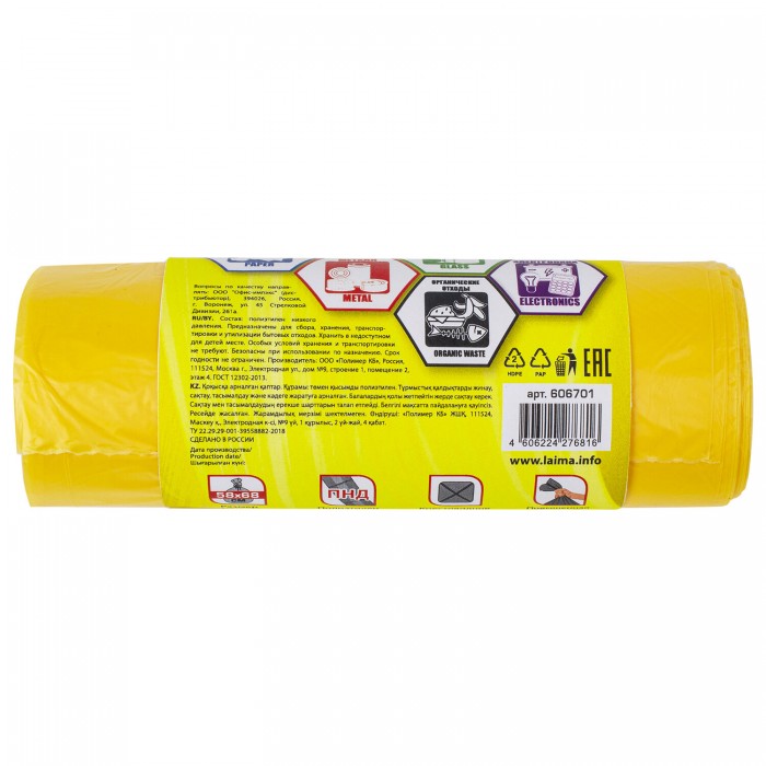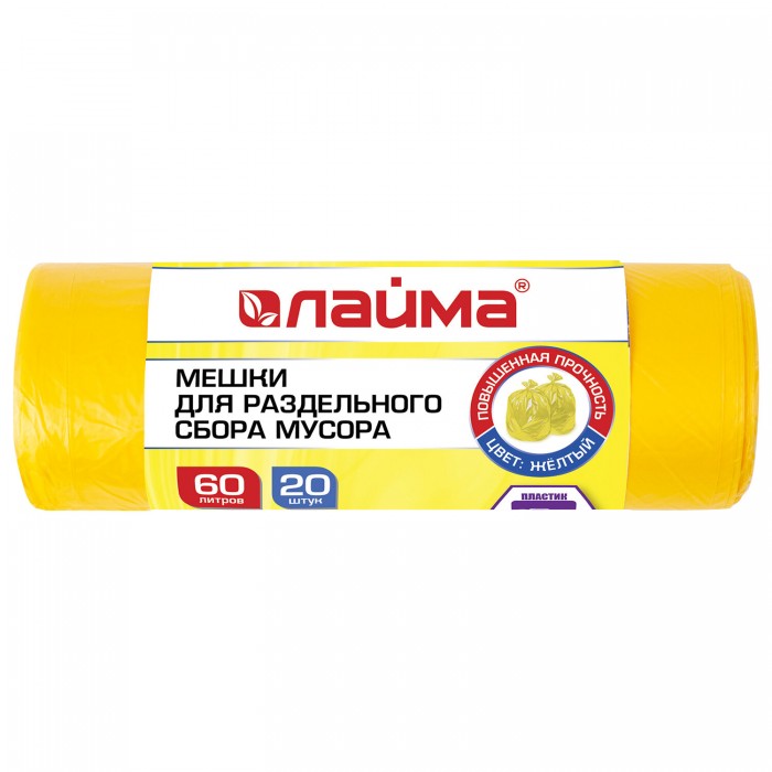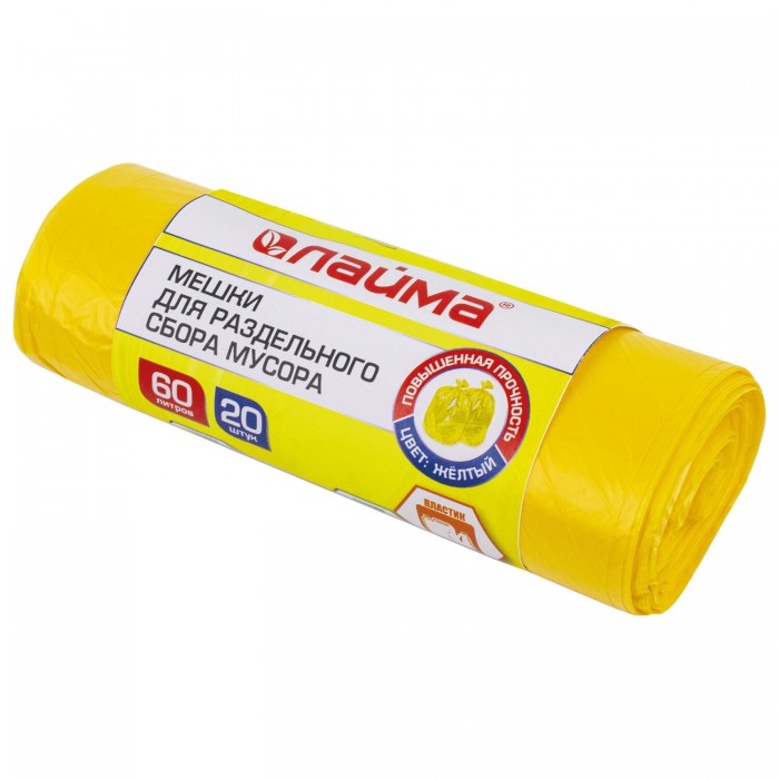 Мешки для раздельного сбора мусора 60 л желтые в рулоне 20 шт., ПНД 10 мкм, 58х68 см, LAIMA, 606701, 3804