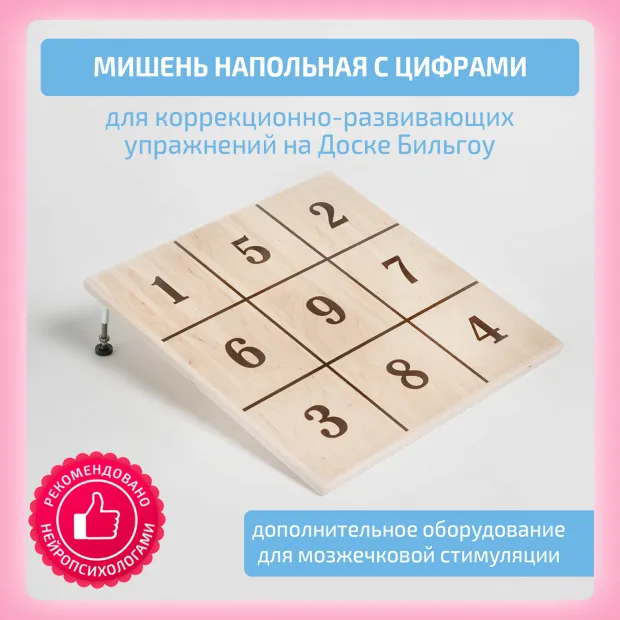 Напольную мишень с цифрами устанавливают на регулируемые ножки высотой до 12 см, с помощью них изменяют угол наклона, их можно убрать и положить тренажер на пол.