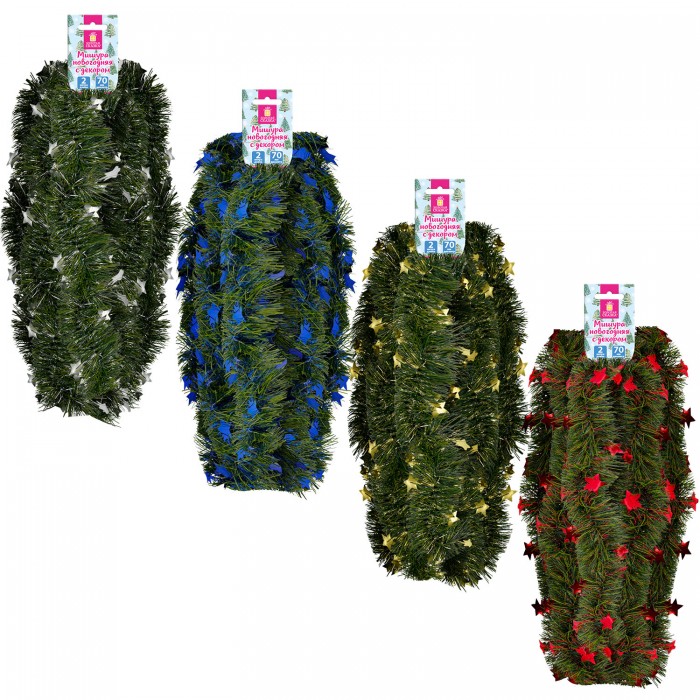 Мишура (1 штука) с декором, диаметр 70 мм, длина 2 м, матовая, ассорти 4 дизайна, ЗОЛОТАЯ СКАЗКА, 592424