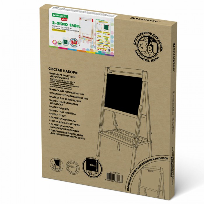 Мольберт растущий 3 в 1 для мела/магнитно-маркерный 50х50 см, бумага для рисования, BRAUBERG KIDS, 238150