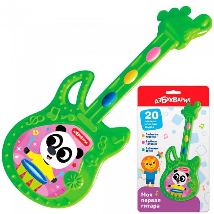 Размер упаковки: 15,2 х 26,5 х 2,6 см Вид упаковки: блистер на картонной подложке Размер гитары: 21 х 8,4 х 2,2 см Страна производитель: КНР Материл: пластик Цвет: зеленый Комплектация: музыкальная игрушка «Моя первая гитара» - 1 шт. Батарейки: 2*АА (в комплекте) Возраст ребёнка: 3+ Музыкальная игрушка «Моя первая гитара» от ТМ «Азбукварик» поднимет своими настроение весёлыми мелодиями! Особенности: - яркий внешний вид; - эргономичная форма; - 20 песенок, мелодий, звуков; - мигающие кнопочки. Игрушечные музыкальные инструменты развивают: - слуховое восприятие; - моторику; - память; - социально-коммуникативные навыки.