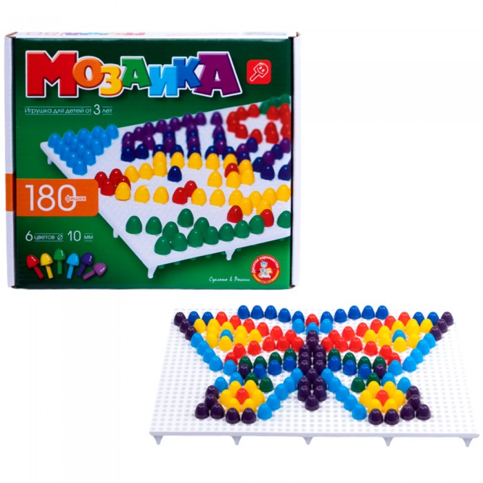 Комплектация: детали мозаики - 180 шт. (6 цветов), поле белое Материал: пластик Упаковка: картонная коробка Размер упаковки: 23*20*3,5 см Диаметр фишки - 10 мм Возраст: 3+ Страна обладатель бренда: Россия Фигурная мозаика состоит из цветных деталей, которые необходимо выкладывать на поле, где ребенок сможет собрать различные цветные рисунки. В инструкции есть примеры готовых композиций, но воображение ребенка может ничем не ограничиваться. Фишки имеют различные цвета, так что рисунки будут получаться красочными и необычными, а на белом фоне они приобретают уникальный стиль. Детали очень гладкие и приятные на ощупь, работа с ними расслабляет ребенка и успокаивает.