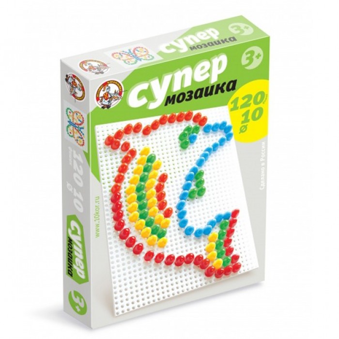 Размер упаковки: 28х19,5х2 см Упаковка: картонная коробка Состав: пластик Комплектность: 120 фишек, прямоугольное поле с отверстиями Страна происхождения: Россия Набор цветной пластиковой мозаики, состоящей из 120 деталей пяти разных цветов дает широкий простор для детского творчества и фантазии. Диаметр фишки - 1 см, и они очень удобны для детской руки. Это отличная игра, предназначенная для развития мелкой моторики, воображения и изучения цветов.