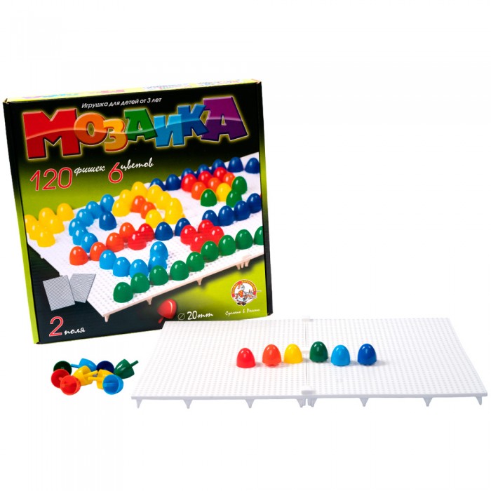Размер игрового поля: 28х28х4 см Упаковка: картонная коробка Состав: пластик Комплектность: 120 фишек, прямоугольное поле с отверстиями 2 шт., фишки для соединения полей 3 шт. Страна происхождения: Россия Набор цветной мозаики, состоящий сразу из двух прямоугольных полей, которые можно соединить вместе, а так же 120 крупных фишек шести разных цветов. С такой мозаикой можно создать картинки еще большего размера и более интересные по содержанию. Диаметр фишки - 2 см, и они очень удобны для детской руки. Это отличная игра, предназначенная для развития мелкой моторики, воображения и изучения цветов.