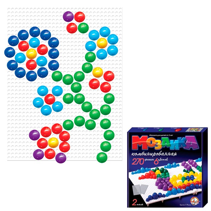 Размер игрового поля: 28х28х4 см Упаковка: картонная коробка Состав: пластик Комплектность: 270 фишек, прямоугольное поле с отверстиями 2 шт., фишки для соединения полей 3 шт. Страна происхождения: Россия Этот набор содержит в себе сразу 270 фишек шести разных цветов и 2 игровых поля, которые можно легко соединить между собой - отличная мозаика для полета детской фантазии! Фишки сразу трех разных диаметров 1, 1,5 и 2 см делают собираемые картинки еще интереснее, и дают возможность познакомиться с понятием "больше-меньше". Это отличная игра, предназначенная для развития мелкой моторики, воображения и изучения цветов.