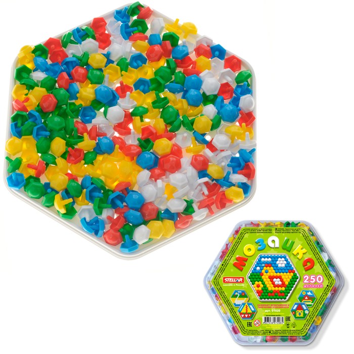 Размер изделия: 22х19,5х3 см Упаковка: прозрачная коробочка (полистирол) в термоусадочной плёнке Состав: пластик Комплектность: 250 деталей, шестигранное поле с отверстиями Страна происхождения: Россия Знакомая с детства шестигранная мозаика на шестигранном поле - в ярком исполнении. Игрушка изготовлена из качественного, нетоксичного пластика. Целых 250 фишек, диаметром 1,3 см, дают большой простор для детского творчества и фантазии, развивают мелкую моторику, пространственное воображение и цветовое восприятие. На этикетке изображены несколько примеров сборки, которым ребенок может следовать при знакомстве с игрой, а затем придумывать собственные варианты картинок. Мозаика находится в удобном пластиковом футляре, благодаря которому мелкие детали не растеряются.