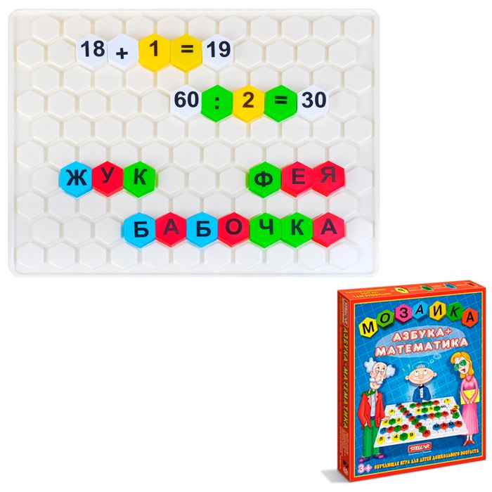 Размер упаковки: 26х3х31 см Упаковка: картонная коробка Состав: пластик Комплектность: 110 деталей, прямоугольное поле с отверстиями Страна происхождения: Россия Мозаика азбука+математика - это отличное учебное пособие, которое в игровой форме поможет выучить алфавит, научиться составлять слога и слова, изучить цифры и основные арифметические действия. Игра отлично развивает мелкую моторику ребенка, цветовое восприятие и воображение, усидчивость и концентрацию внимания.