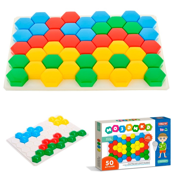 Размер упаковки: 39х27х5 см Состав: пластик Упаковка: картонная коробка Комплектация: 50 элементов Страна происхождения: Россия Мозаика из крупных элементов ярких цветов прекрасно подойдет для малышей. С ней они смогут составлять первые орнаменты и фигуры, тренируя свою фантазию и воображение, одновременно учась правильному захвату предметов. Изделие изготовлено из качественных нетоксичных материалов, безопасных для здоровья ребенка.