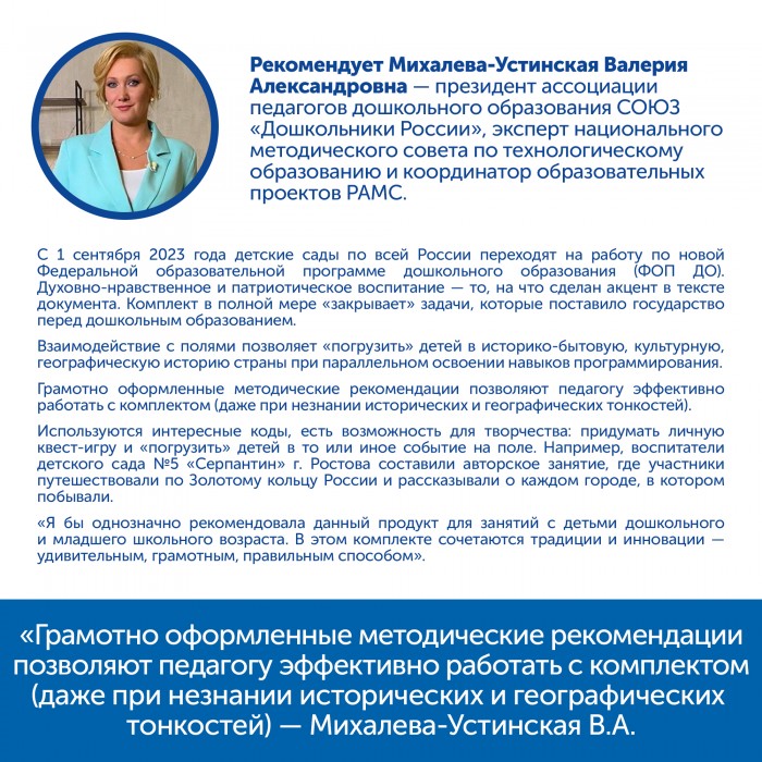 Рекомендует Михалева-Устинская Валерия Александровна, президент общественного профессионального сообщества педагогов дошкольного образования СОЮЗ «Дошкольники России»: «Методические рекомендация оформлены грамотно, позволяют педагогу эффективно работать с комплектом, даже при незнании исторических и географических тонкостей».