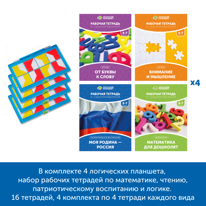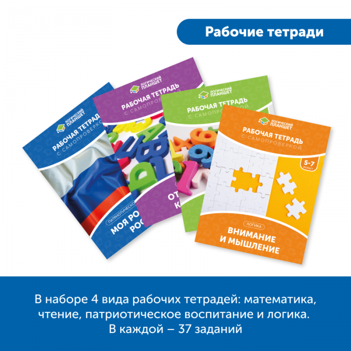 - 16 рабочих тетрадей по предметных областям: математика, чтение, патриотическое воспитание и логика (по 6 каждого вида)
