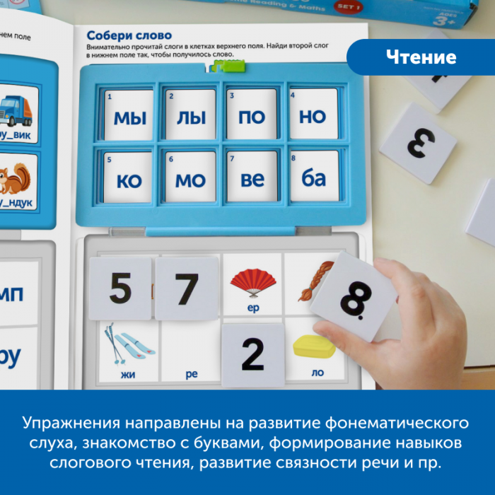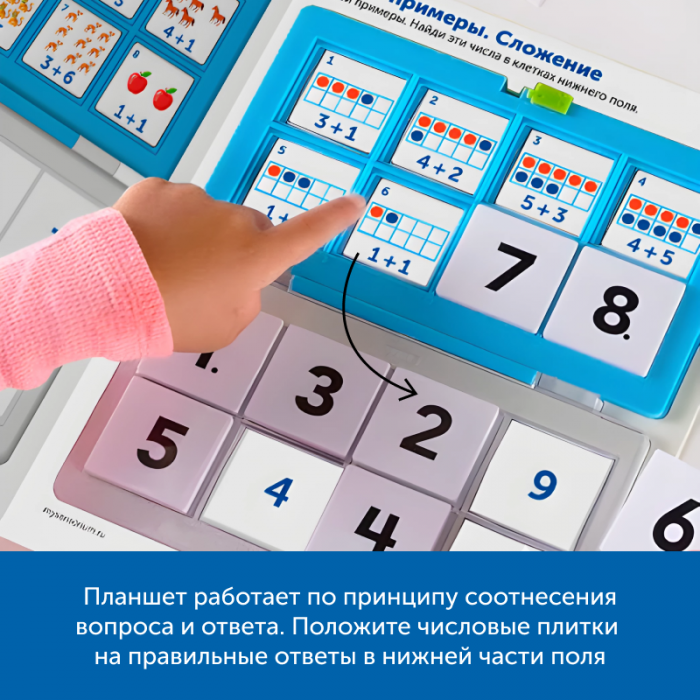Планшет работает по принципу соотнесения вопроса и ответа. Положите числовые плитки на правильные ответы, а затем проверьте себя – переверните планшет и сравните узор с образцом.