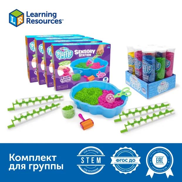 Образовательный комплект Playfoam Pluffle предназначен для сенсорной релаксации дошкольников в детском саду. Масса для лепки Playfoam Pluffle не имеет аналогов в мире. Благодаря специальной безопасной формуле масса не засыхает, не пачкает стол и одежду, не оставляет ощущения липкости или слизи на руках. Дети могут смешивать цвета "живого песка" Playfoam Pluffle, сжимать и давить его, отпускать и наблюдать, как масса рассыпается и "утекает" сквозь пальцы, будто живая! Систематические занятия с комплектом способствуют концентрации внимания, благодаря успокаивающему массажному воздействию на пальчики и ладошки. С помощью инструментов, входящих в комплект, у детей формируются необходимые навыки мелкой моторики.