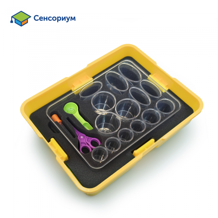 - Развитие мелкой моторики, координации и захвата благодаря инструментам: игровые ножницы, пипетка, мерная ложка-шумовка.