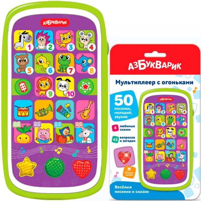 Размер упаковки: 13,2 х 2,2 х 22,7 см Размер изделия: 8,2 х 2,1 х 15 см Функционал: музыкальные игрушки Вид упаковки: блистер на листе Страна производитель: КНР Материал: металл, пластик Комплектация: игрушка мультиплеер - 1 шт Возраст ребенка: для детей от 3 лет Ваш малыш любит песенки, сказки и веселые игры? Тогда этот мультиплеер с огоньками – для него. Особенности: - 4 сказки - 50 песенок, мелодий и звуков - 45 вопросов и загадок. - яркий дизайн с хорошо прорисованными детскими персонажами - для работы необходимы батарейки 3 x AAA (в комплекте демонстрационные)