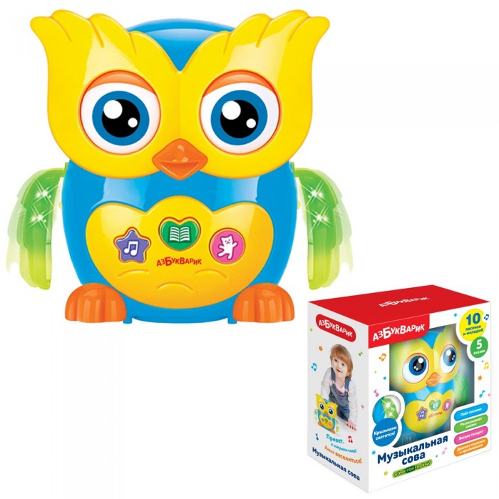Размер упаковки: 17,5 х 20 х 1,5 см Вид упаковки: картонная коробка Размер изделия: 13 х 14 х 9,8 см Страна производитель: КНР Материал: пластик Батарейки: 3АА (в комплете демонстрационные) Возраст: 3+ Музыкальная слова от ТМ «Азбукварик» станет оригинальным подарком для детей дошкольного возраста. Особенности: - очаровательный дизайн игрушки; - сова умеет петь и махать руками; - знает сказки («Курочка Ряба», «Колобок», «Репка», «Теремок», «Заюшкина избушка»); - двигаются глазки и крылышки. В процессе игры ребенок развивает: - мелкую моторику; - слуховое восприятие; - музыкальные способности; - воображение.