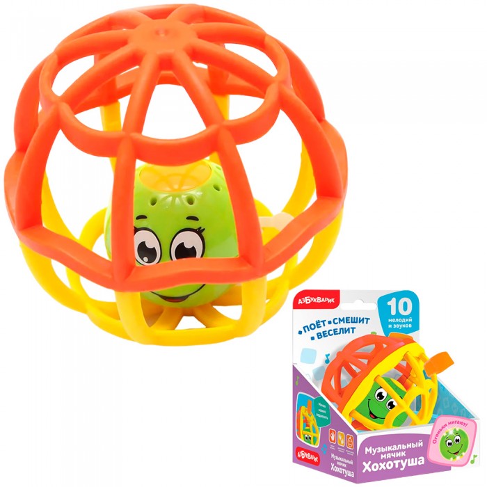 Размер упаковки: 11 х 14 х 10 см Вид упаковки: картонная коробка Страна производитель: КНР Материал: пластик Цвет: оранжевый-желтый Комплектация: музыкальный мячик «Хохотушка» – 1 шт. Батарейки: 3AG13/3LR44 (в комплекте) Возраст ребенка: 3+ Веселая музыкальная игрушка «Хохотушка» от ТМ «Азбукварик» развлечет вашего малышу и принесет много ярких эмоций! Мягкий гибкий пластик приятно сжимать маленькими ручками: это отлично развивает мелкую моторику и тактильное восприятие. Изготовлена игрушка из высококачественных, безопасных материалов.