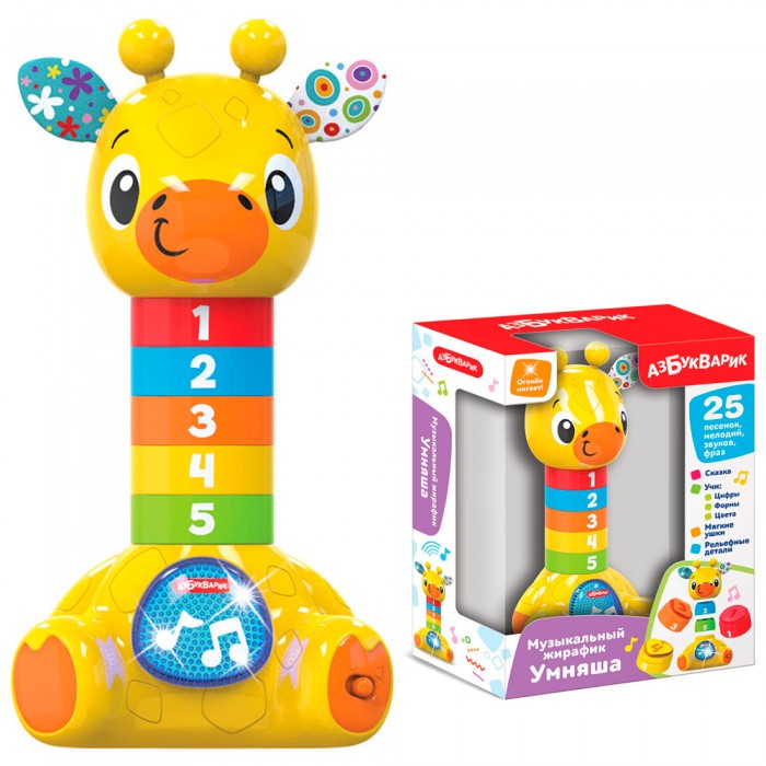 Размер упаковки: 17,5*8,7*24 см Размер изделия: 10,5*7,5*19,8 см Функционал: музыкальная игрушка, свет, обучающие функции (цифры и счет, формы, цвета), тактильные и рельефные элементы, 25 песенок, мелодий, звуков, фраз, сказка Упаковка: картонная коробка открытого типа Страна обладатель бренда: Россия Материал: пластик Комплектация: игрушка - 1 шт. Возраст ребёнка: от 1 года Оригинальная яркая музыкальная игрушка с различными функциями - прекрасный подарок малышу. Она предназначена для активных игр и развития мелкой моторики и координации движений. Яркая расцветка развлечет малыша и привлечет его внимание. Игрушка учит пониманию причинно-следственной связи, помогает тренировать моторику и координацию движений, восприятие формы и цвета. Музыкальная игрушка оборудована кнопками, нажимая на которые можно прослушать мелодии. Нажимая на кнопочку с огоньком, ребенок послушает интересную сказку «Жирафик в цирке», 5 песенок («Как много игрушек на свете!», «Как хорошо уметь счита