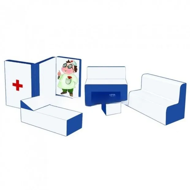 Кожзам и Поролон. УФ печать. Состоит из 5ти модулей. Софа: 600х400х260/520мм - 1шт. Кушетка: 900х400х300мм - 1шт. Столик: 600х400х700мм - 1шт. Пуфик: 300х300х260мм - 1шт. Ширма: 1200х40х700мм -1шт. Цвета: Синий,Белый,Красный. (вес 9кг 0,33м/куб)