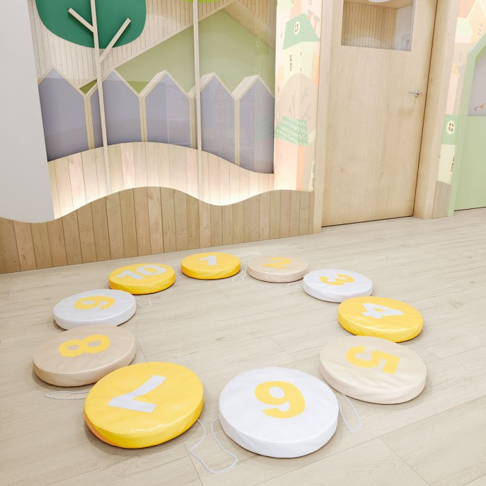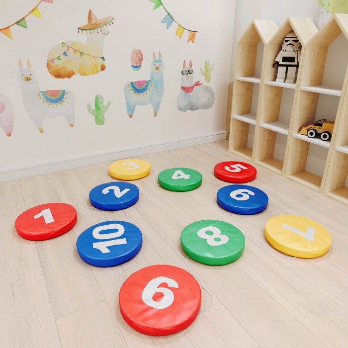 Мягкий развивающий модуль «Шагайка» - это десять кругов диаметром 300 мм, соединенные между собой. Помогают научиться считать и развить координацию у ребенка. Габаритные размеры 50 х 300 мм