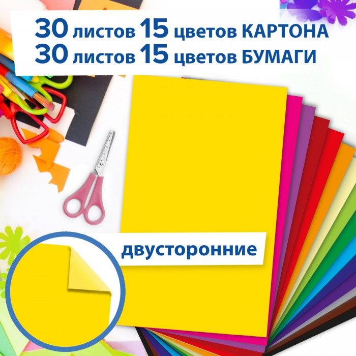 Набор цветного картона и бумаги А4 ТОНИРОВАННЫХ В МАССЕ, 30+30 л., 15 цв., BRAUBERG, "Радуга", 115087