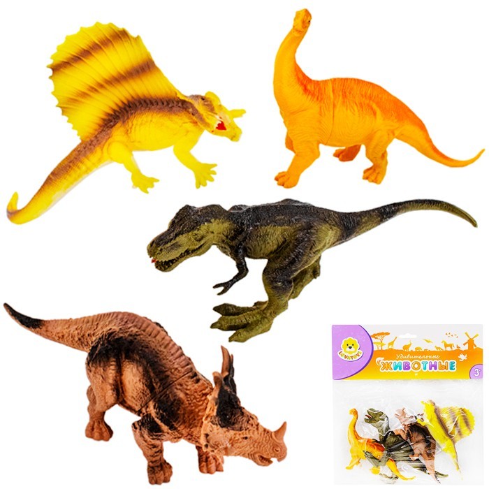 Размер упаковки: 27 х 25 х 4 см Вид упаковки: пакет с хедером Страна производитель: КНР Материал: ПВХ Комплектация: тираннозавр (18 х 12 х 6 см) – 1 шт., диплодок (15 х 10,5 х 4 см) – 1 шт., трицератопс (15 х 7 х 5 см) – 1 шт., диметродон (17 х 8 х 7 см) – 1 шт. Возраст: 3+ Динозавры – это древние ящеры, которые обитали на нашей планете. Трудно себе представить, что эти гигантские ящерицы когда-то жили. Их существование будоражит воображение не только детей, но и даже взрослых. Фигурки реалистичных динозавров от LEVATOYS несомненно станут одними из любимых игрушек ребёнка. Каждая фигурка хорошо детализированная и выполнена из высококачественных, нетоксичных материалов. Набор предназначен для изучения ребенком окружающего мира. Играя с фигурками динозавров, малыши развивают сенсорное восприятие, мелкую моторику, воображение, а также знакомятся с различными формами и цветами. Игрушки отлично подойдут для увлекательных сюжетных-ролевых игр.