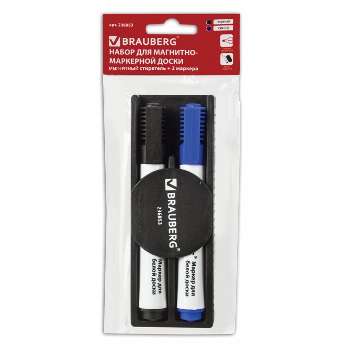 Набор для магнитно-маркерной доски (магнитный стиратель, 2 маркера 5 мм: черный, синий), BRAUBERG, 236853