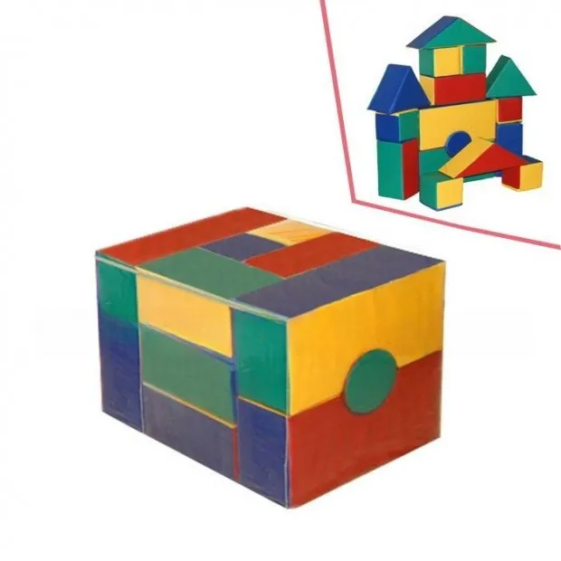 Кожзам и Поролон Размер упаковки: 600х600х800 Состоит из 19ти модулей. Куб: 200х200х200мм - 6 шт. Прямоугольник: 400х200х200мм - 3 шт. Треугольник: 600х200х200мм - 2 шт. Треугольник: 400х200х300мм - 2 шт. Мост: 600х200х300мм - 4 шт. Столбик: диам.-200мм , высота-200мм - 2 шт. Цвета: Красный,Синий,Желтый,Зеленый упак.: Вес: 7,2кг Объём: 0,288м/куб.