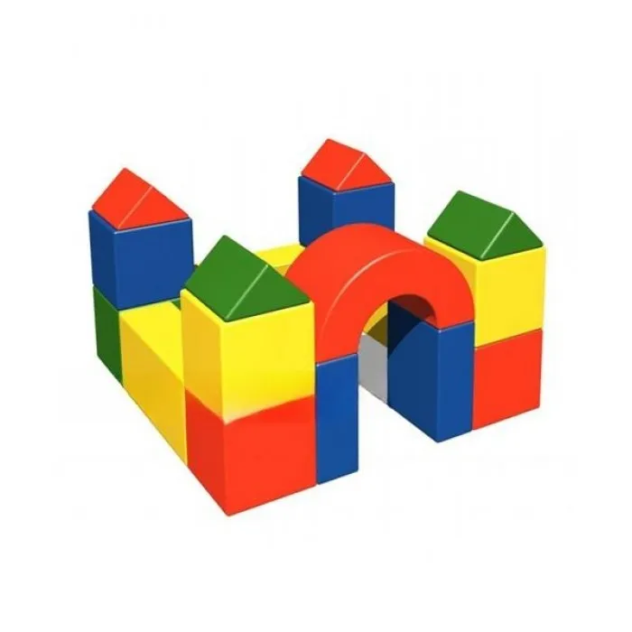 Кожзам и Поролон. Размер: 1200х1200х850мм Состоит из 18 модулей. Куб: 300х300х300мм - 8шт. Прямоугольник: 600х200х300мм - 3шт. Прямоугольник: 300х100х400мм - 2шт. Арка: 600х300х300мм - 1шт. Треугольник: 250х250х200мм -4шт. Цвета: Красный,Синий,Желтый,Зеленый (вес 12кг 0,452м/куб)