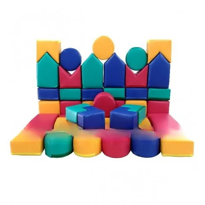 Кожзам и Поролон. Состоит из 40 модулей. 1.Куб: 2 00х200х200мм - 6шт. 2.Прямоугольник: 200х200х100мм - 6шт. 3.Прямоугольник: 300х200х100мм - 4шт. 4.Домик: 300х200х200мм - 4шт. 5.Флажок: 200х200х150мм - 4шт. 6.Ступенька: 200х200х100мм - 4шт. 7.Брусок: 800х100х100мм - 4шт. 8.Таблетка: диам.200мм, высота.100мм - 8шт. Цвета: Красный,Синий,Желтый,Зеленый (вес 7кг 0,26 м/куб)