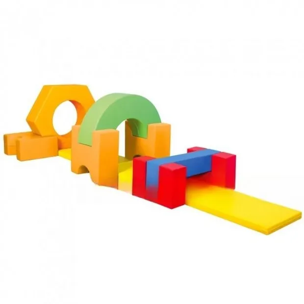Кожзам и Поролон. Состоит из 11 модулей. Мат: 2000х600х40мм - 2 шт. Балка: 12 00х300х300мм - 1 шт. Дуга: диаметр 900х300мм - 1 шт. Шестиугольник: диаметр 900х300мм - 1 шт. Опора: 900х300х600мм - 2 шт. Опора: 500х300х800мм - 4 шт. Вес: 44кг Объём: 1,65м/куб.