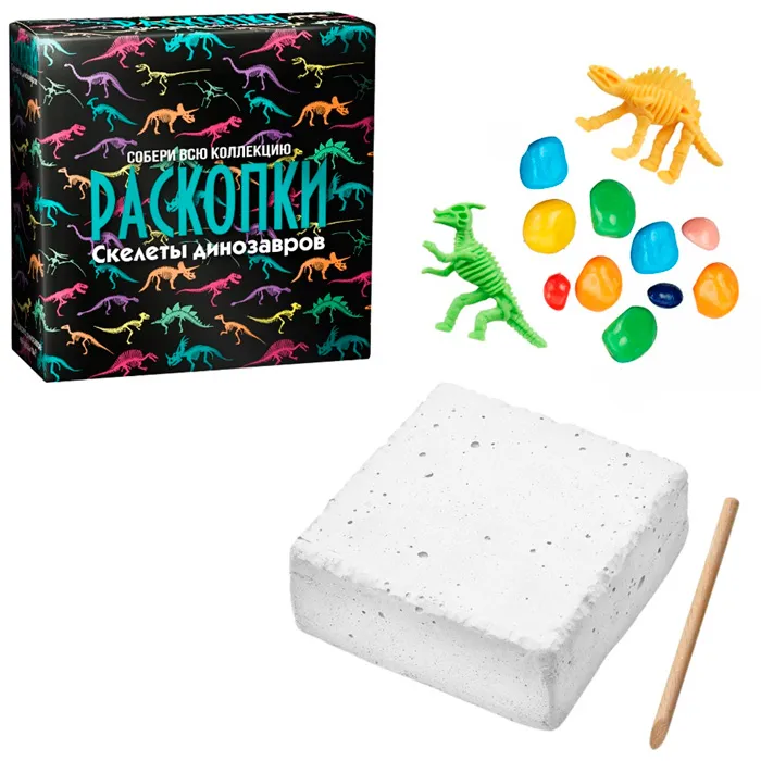 Размер упаковки: 11,5 x 11,5 x 45 см Вес: 360 г Функционал: настольные игры Вид: настольная игра-квест Упаковка: картонная коробка Страна обладатель бренда: Россия Материал: гипс, мел, пластик, камень, дерево Комплектация: деревянный стек для дробления, окаменелый грунт с сокровищами (россыпь разноцветных фигур из пластика, фигурные подвески-бусины для создания украшения в пиратском стиле). Цвета находок в ассортименте. Возраст ребенка: детям с 6+ лет. Открывайте коробочку и доставайте инструменты - приготовьтесь стать настоящим археологом! С помощью этого набора вы сможете отыскать скелеты настоящих динозваров. Сможете угадать, что это за динозавр? Как в настоящих археологических раскопках, вам будут попадаться и цветные камушки, но наберитесь терпения, и тогда вы сможете начать изучение своих находок! Предлагаем собрать всю коллекцию и открыть мини-музей скелетов динозавров. Чтобы копать было проще, рекомендуем немного смочить водой брусок для раскопок.