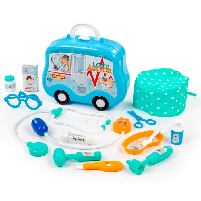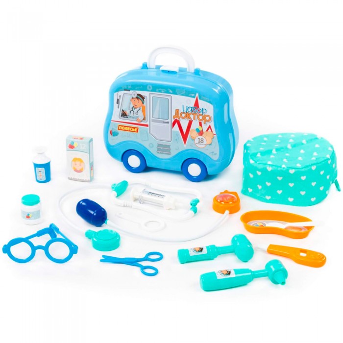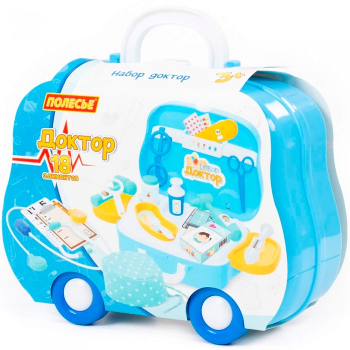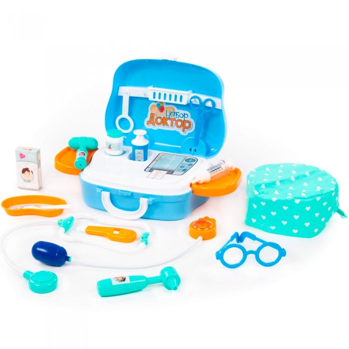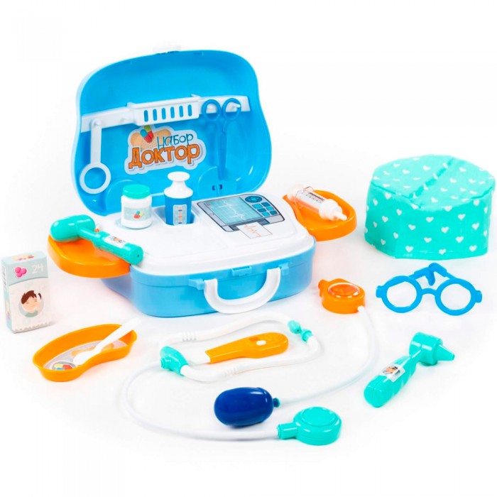 Размер упаковки: 26,6*9,8*21,7 см Функционал: игровой тематический набор, обучение профессии врача Упаковка: пластиковый чемодан Страна обладатель бренда: Беларусь Материал: пластик, текстиль Комплектация: колпак медицинский; столик для мед. инструментов; боковые полки; - набор наклеек; бланк-рецепт; проверочная таблица окулиста; коробочка для таблеток; набор таблеток; полка-держатель для мед. инструментов; ложечка; лупа; ножницы; термометр; очки; лоток; фонендоскоп (для выслушивания шумов внутренних органов); отоскоп (инструмент лор-врача); тонометр (для измерения артериального давления); молоточек; шприц; мерный стаканчик с крышкой; баночка для лекарств; Возраст ребенка: от 3 лет Набор доктора подойдет как для игр дома, так и для оформления уголка профессий в детском саду. Он содержит основные инструменты врача, благодаря чему ребенок узнает их названия и предназначение и сможет устроить ролевую игру. Для игр, имитирующих профессии, есть множество различныхприборов и аксессуаров, ко